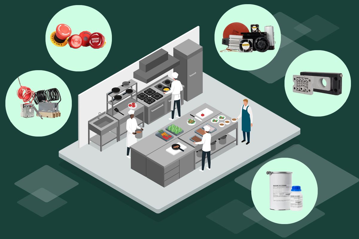 Med ett brett sortiment av elektronikkomponenter erbjuder vi skräddarsydda lösningar för storköks- och restaurangmaskiner. Vårt utbud omfattar allt från dispenserbara tätningar och flexibla värmare till genomföringar, ljusindikering och overlaylösningar. Vi kan även leverera komponenter som peltierkylare, temperatursensorer, termostater och överhettningsskydd, samt timer- och vridströmställare för styrning och säker drift.